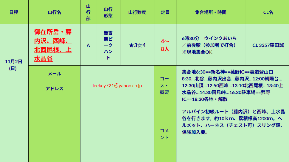 アルパイン部「御在所岳・藤内沢、西峰、北西尾根、上水晶谷」の案内です。CLは3357窪田さんです。小人数の開催ですので早いもん勝ちです。