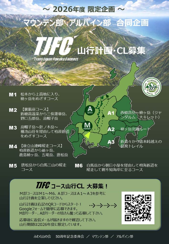 50周年記念委員会からのお知らせです。2月3日(火)に50周年記念委員会を開催して、現状の進捗状況を確認しました。ハイキング部は上街道~中山道までの各コースのCL、日程などが決定されていますが、上高地から日本海に抜ける山岳コースではまだまだ歯抜け状態です。就きましては、会員の皆さんにお願いです。マウンテン部・アルパイン部合同で山岳コースの計画をして頂けるCLを募集しています。併せて山岳コースの山行計画も募集を致します。下記のチラシが会報に折込チラシとして同封されます。