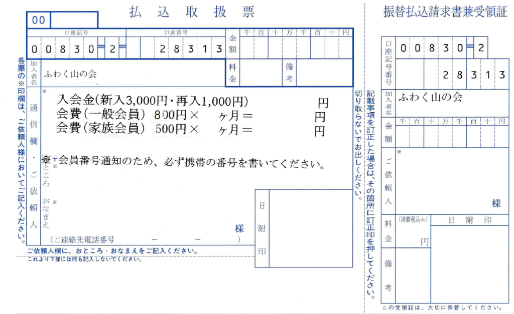 会費払い込み用の 口座名”ふわく山の会” の払い込み用紙を必ず使って下さい。 |